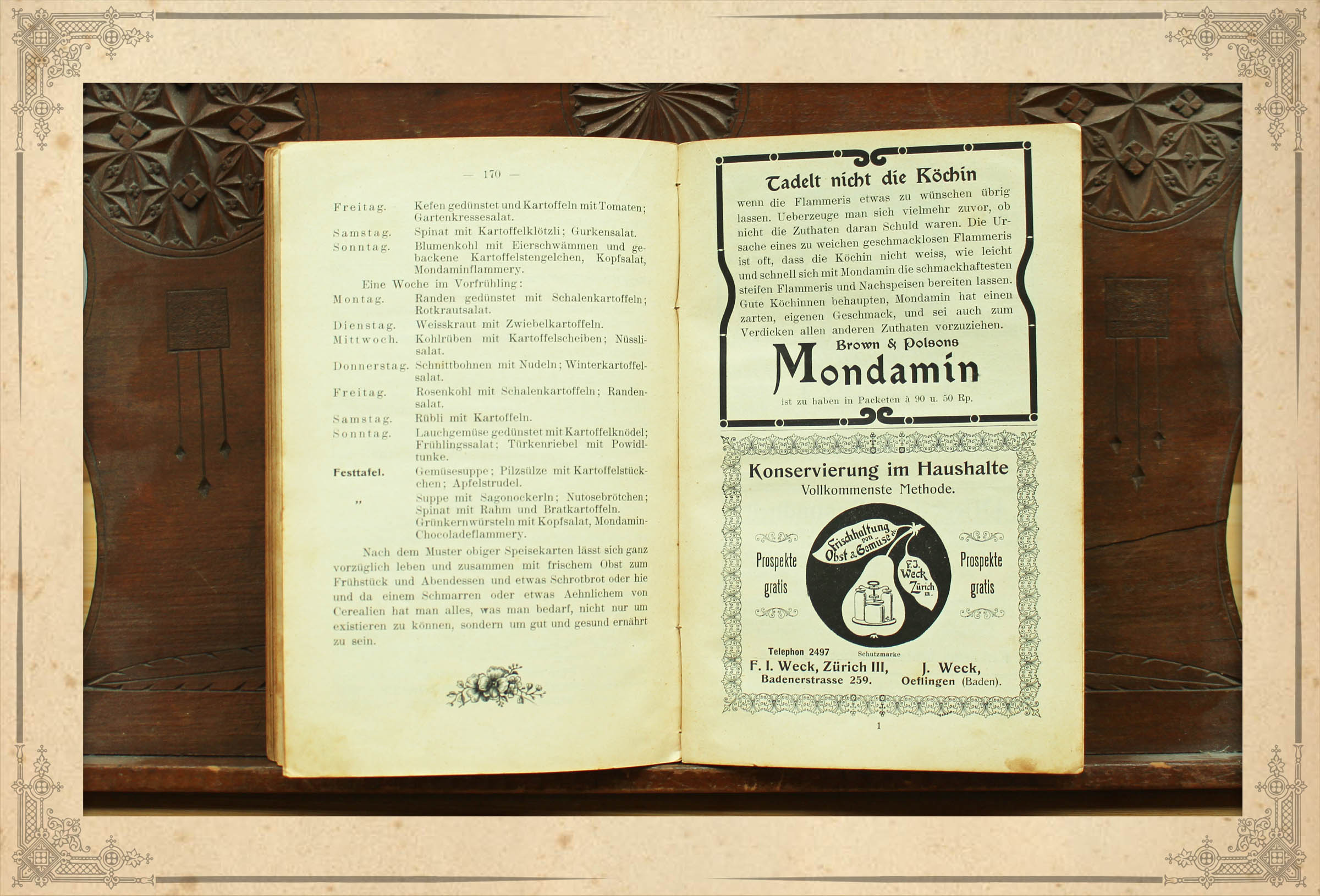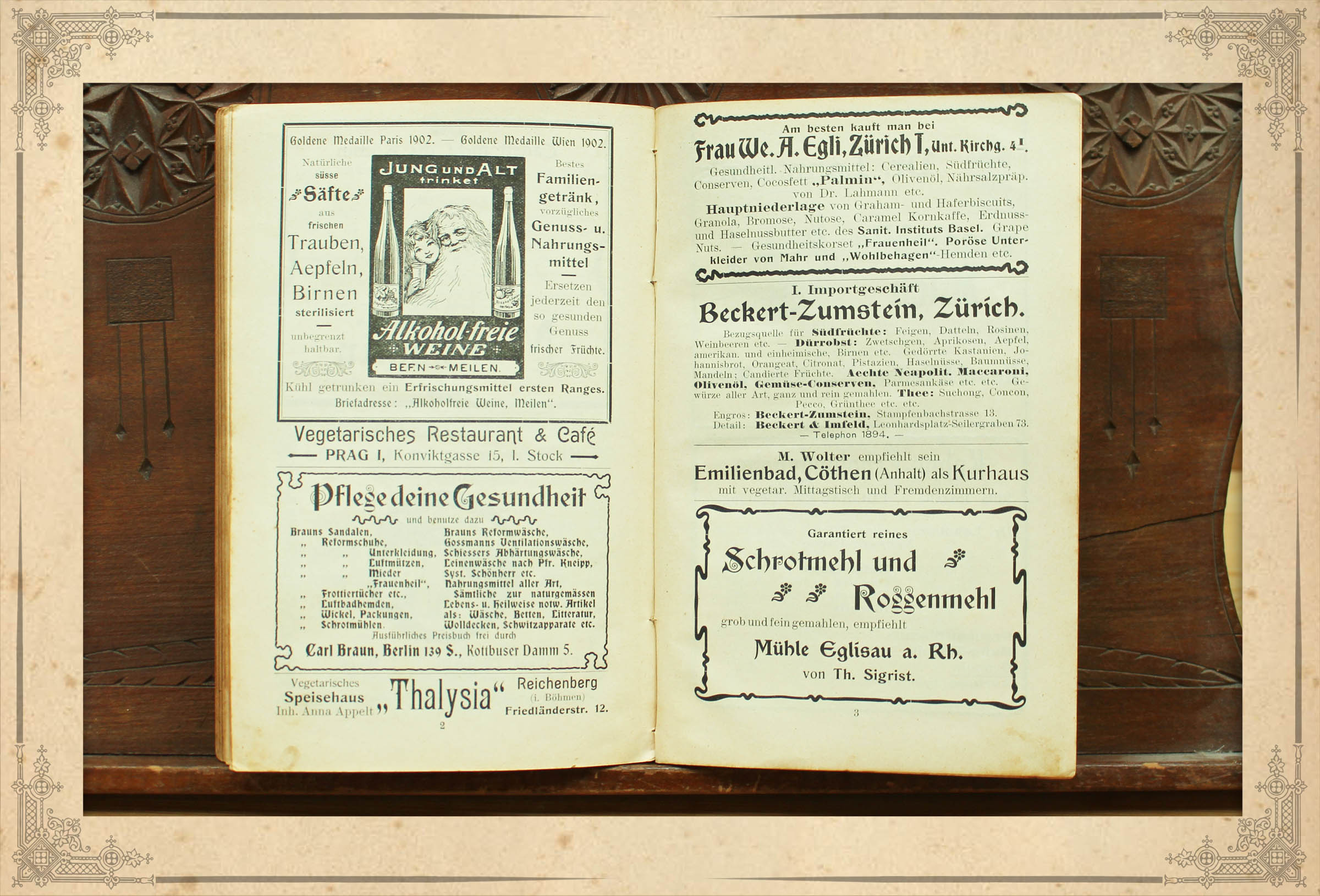 Zudem überraschten mich die zahlreichen Anzeigen im Buch, in denen unter anderem für Gesundheitsmieder und alkoholfreie Weine geworben wird. Das Ehepaar Zollinger waren vermutlich mit anderen Anhängern der Bewegung der Lebensreform gut vernetzt. Im Buch werden vegetarische Restaurants in Prag, Reichenberg (Böhmen) und Cöthen (heute: Köthen) beworben.