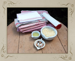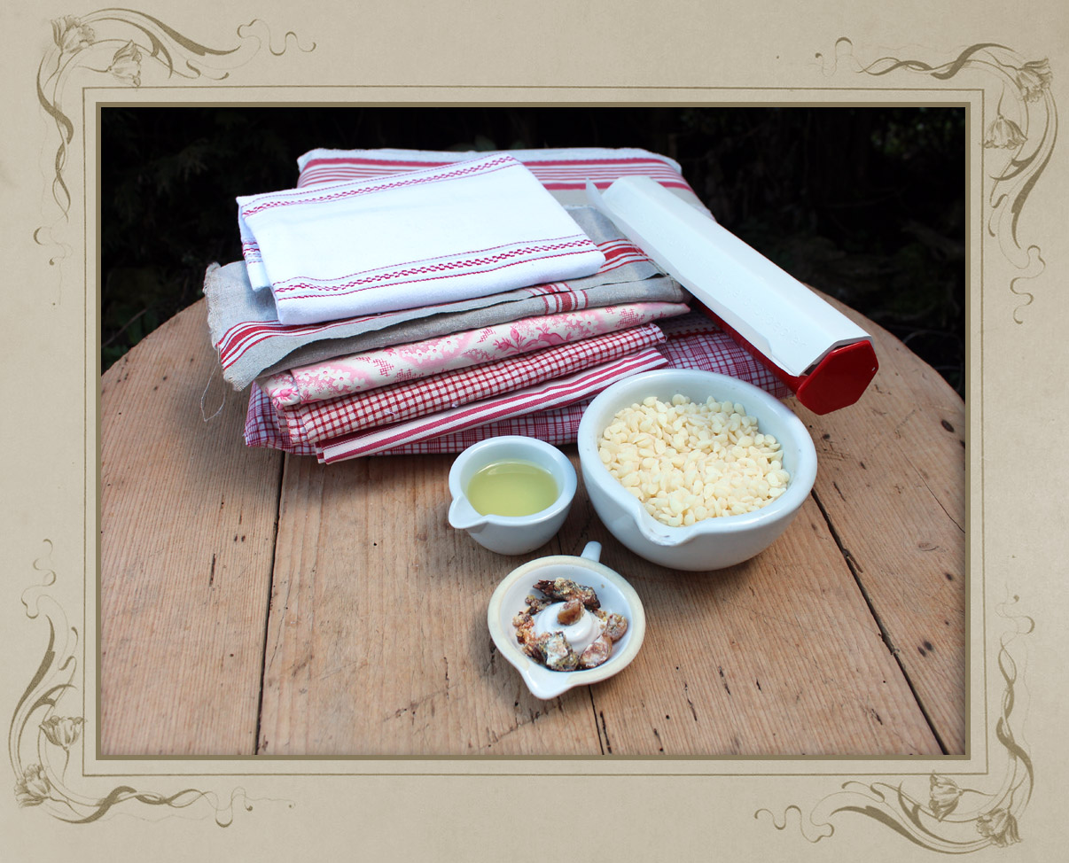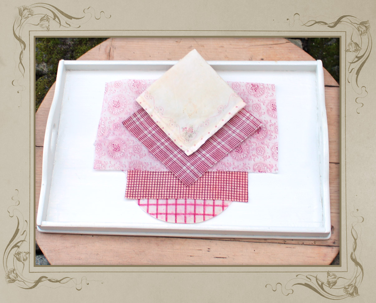Geeignet sind leichte Baumwoll- und Leinenstoffe. Ob nun Stoffreste, Geschirrtücher oder Bettwäsche, wie auch das Design der Stoffe bleibt dem individuellen Geschmack überlassen. Sehr gut eigenen sich auch ausgediente Herrenhemden, aus denen entsprechende Stücke ausgeschnitten werden. Vor allem neue Stoffe müssen zuerst einmal gründlich gewaschen werden, damit die Appretur und eventuelle Schadstoffe entfernt werden. Ich habe sehr viel antike Tisch- und Bettwäsche, sowie altes Leinen. Reste aus Näharbeiten bewahre ich immer auf und die kommen hier zum Einsatz. Da die Stoffe bis zu 100 Jahre alt sind, enthalten sie keine modernen Schadstoffe.