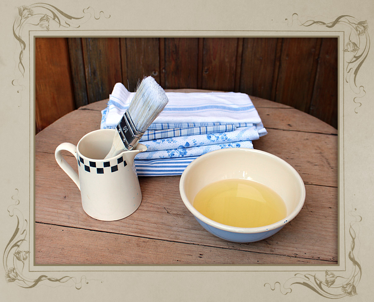Während die Wachsmischung auf dem Herd steht, wird der Arbeitsplatz vorbereitet. Ich lege dafür ein altes Handtuch auf die Küchenarbeitsfläche. Darüber lege ich Butterbrotpapier, Backpapier verwende ich nicht. Darauf kommt dann ein vorbereitetes Stoffstück. Auf dieses wird die flüssige Wachsmischung mit Hilfe eines breiten Pinsels zügig aufgetragen.