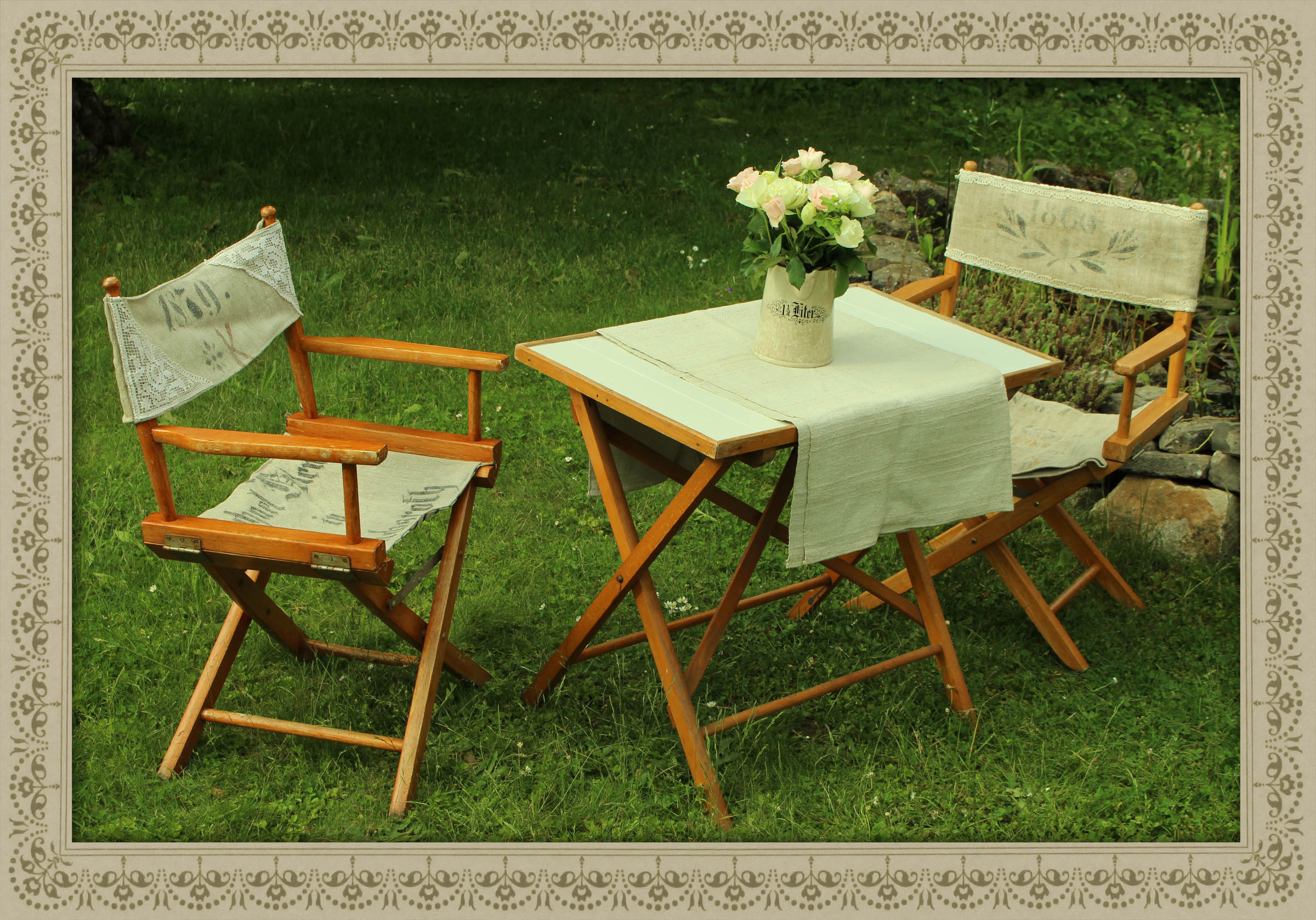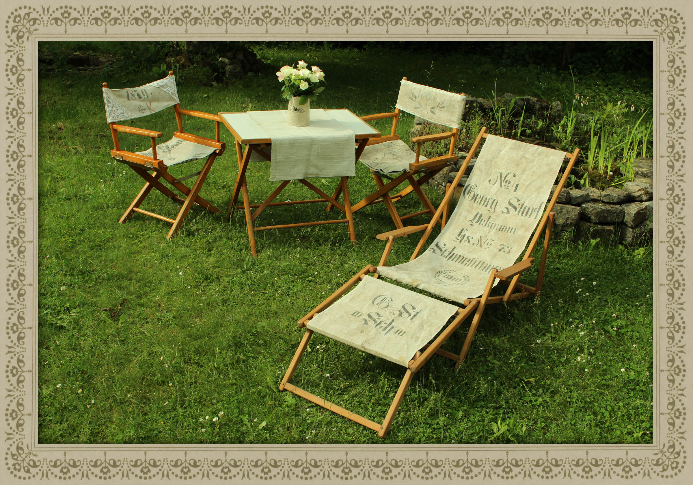 Aus alten Klappstühlen und ausgedienten Getreidesäcken habe ich mir strapazierfähige Gartenmöbel gefertigt.