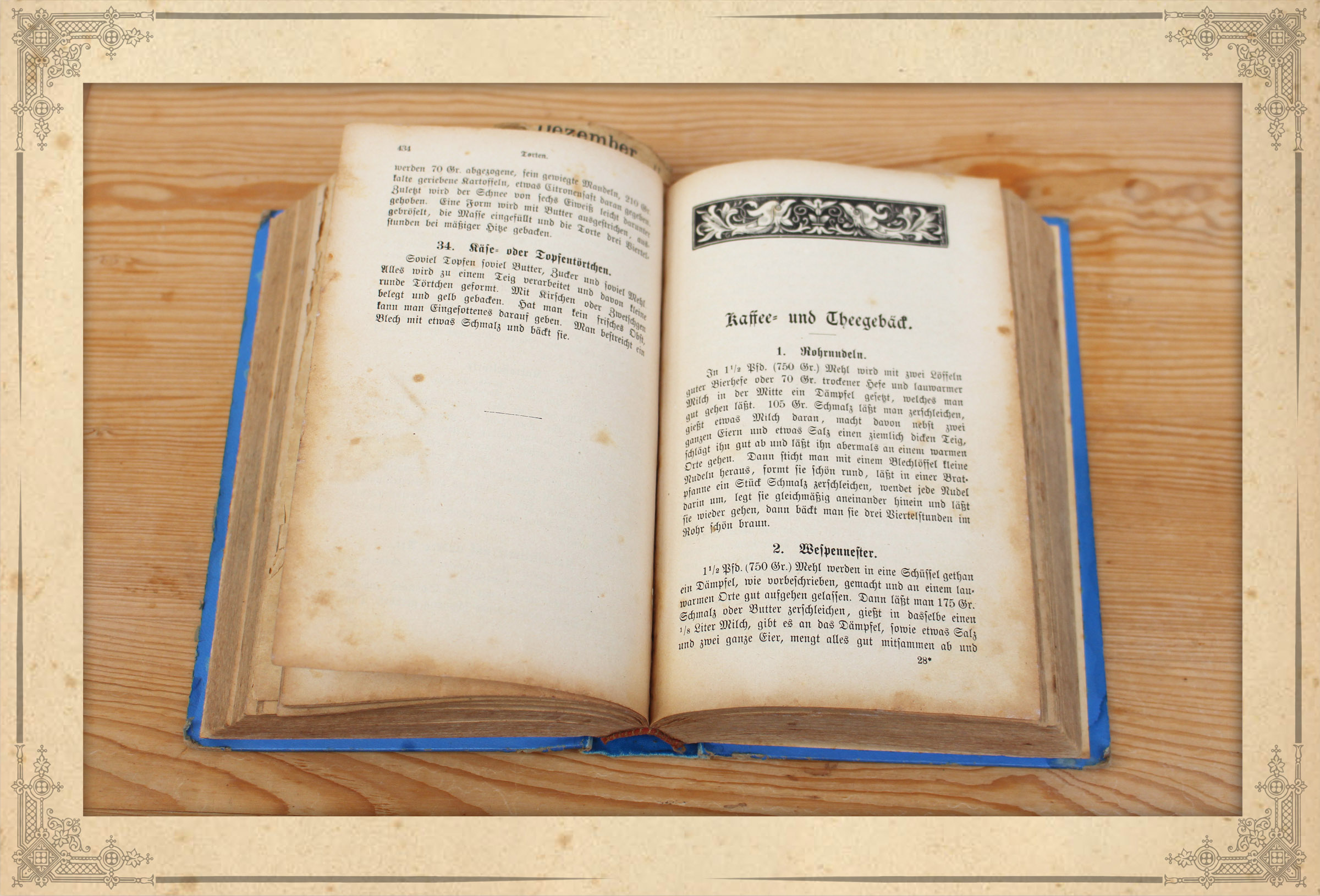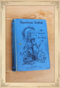 „Marie Schandri’s berühmtes Regenburger Kochbuch mit 1932 Original-Kochrezepte auf Grund vierzigjähriger Erfahrung zunächst für die bürgerliche Küche gänzlich umgearbeitet von Auguste Eber geb. Coppenrath. Siebenunddreißigste einzig rechtmäßige, illustrierte Auflage. Wohlfeile Ausgabe Regensburg 1898, Verlag Alfred Coppenrath.“ Das steht auf dem inneren Titelblatt meines Buches, das offensichtlich sehr gerne und über mehrere Generationen benutzt wurde. Davon zeugen zahlreiche handschriftliche Notizen und mehrere alte Kalenderblätter aus weit zurückliegenden Jahrzehnten.