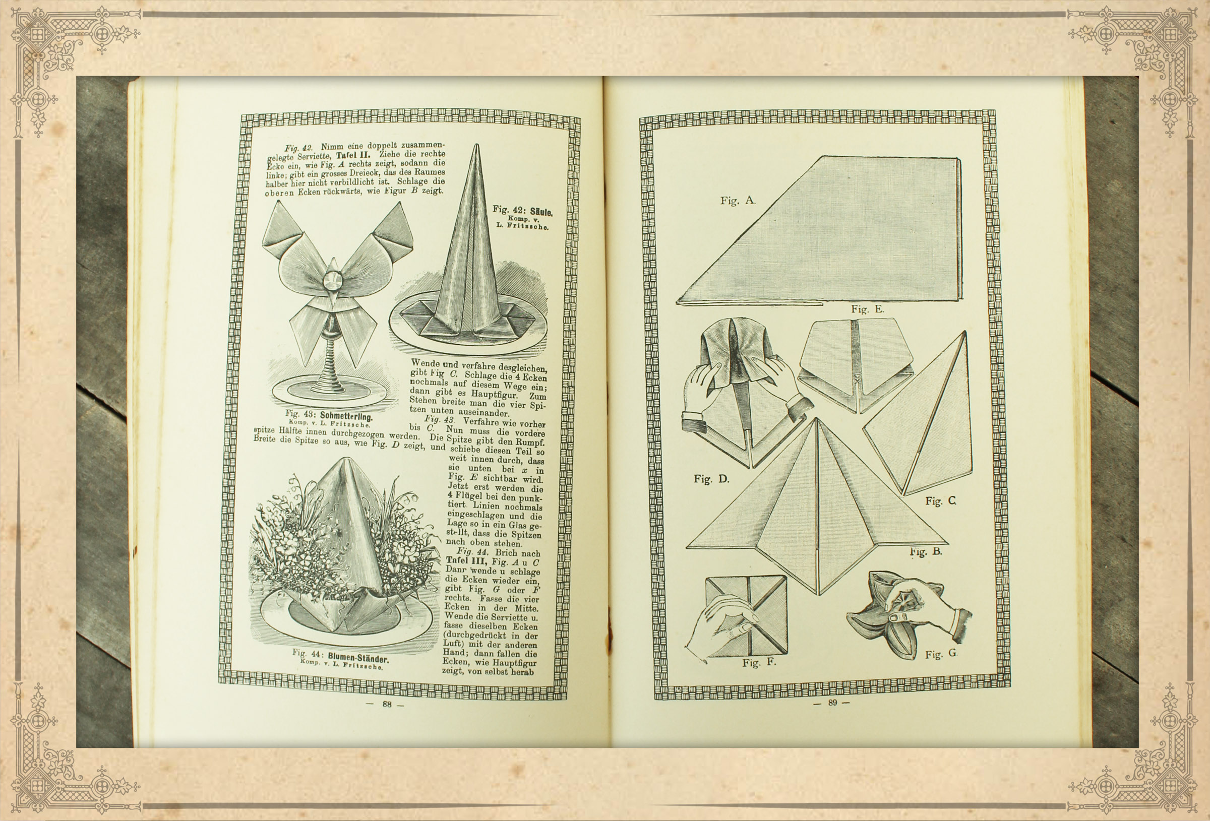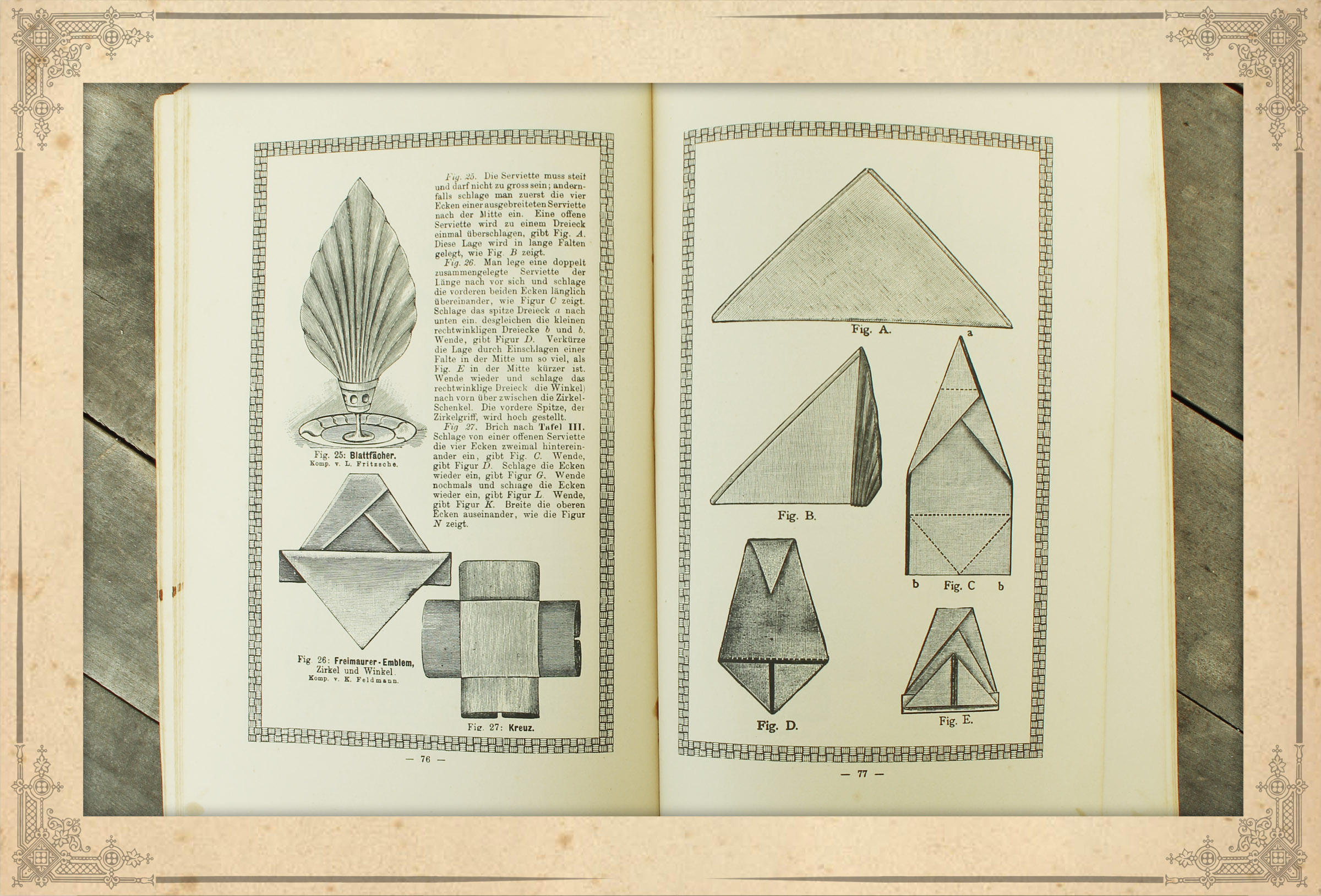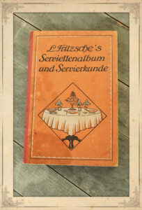 Heinrich Louis Fritzsche zeigt in seinem Servietten-Album an 138 Beispielen über 500 Abbildungen wie originelle und attraktive Schauobjekte aus Servietten hergestellt werden.