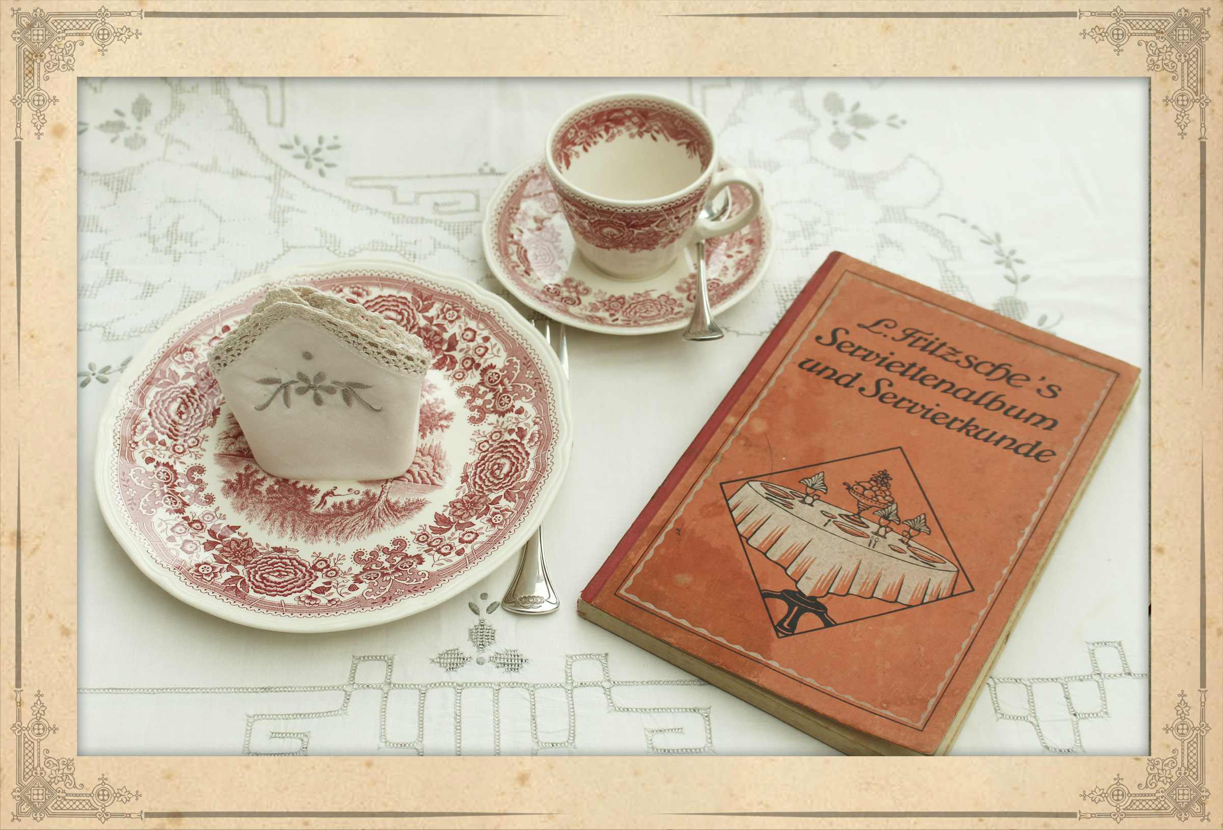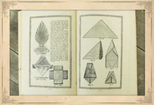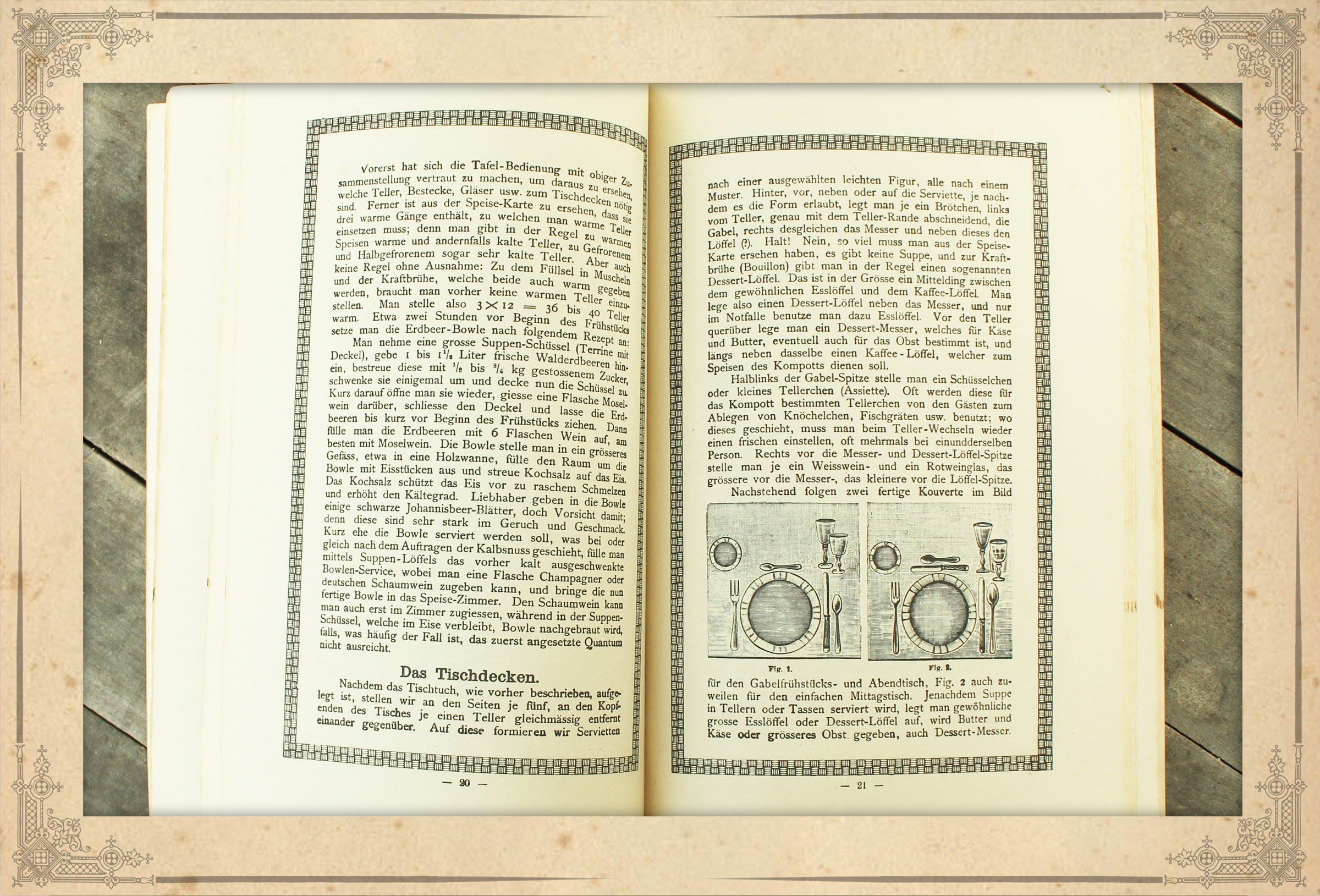 Darüber hinaus ordnet der Autor das Serviettenbrechen in den Zusammenhang des Tischdeckens und Servierens ein. Das Buch gibt einen detaillierten Einblick in die zeitgenössische Tischkultur und die feinen Tischsitten. Es zeigt festlich gedeckte Tafeln für Abendgesellschaften sowie stilvolle Arrangements für den Frühstückstisch oder den Nachmittagstee.