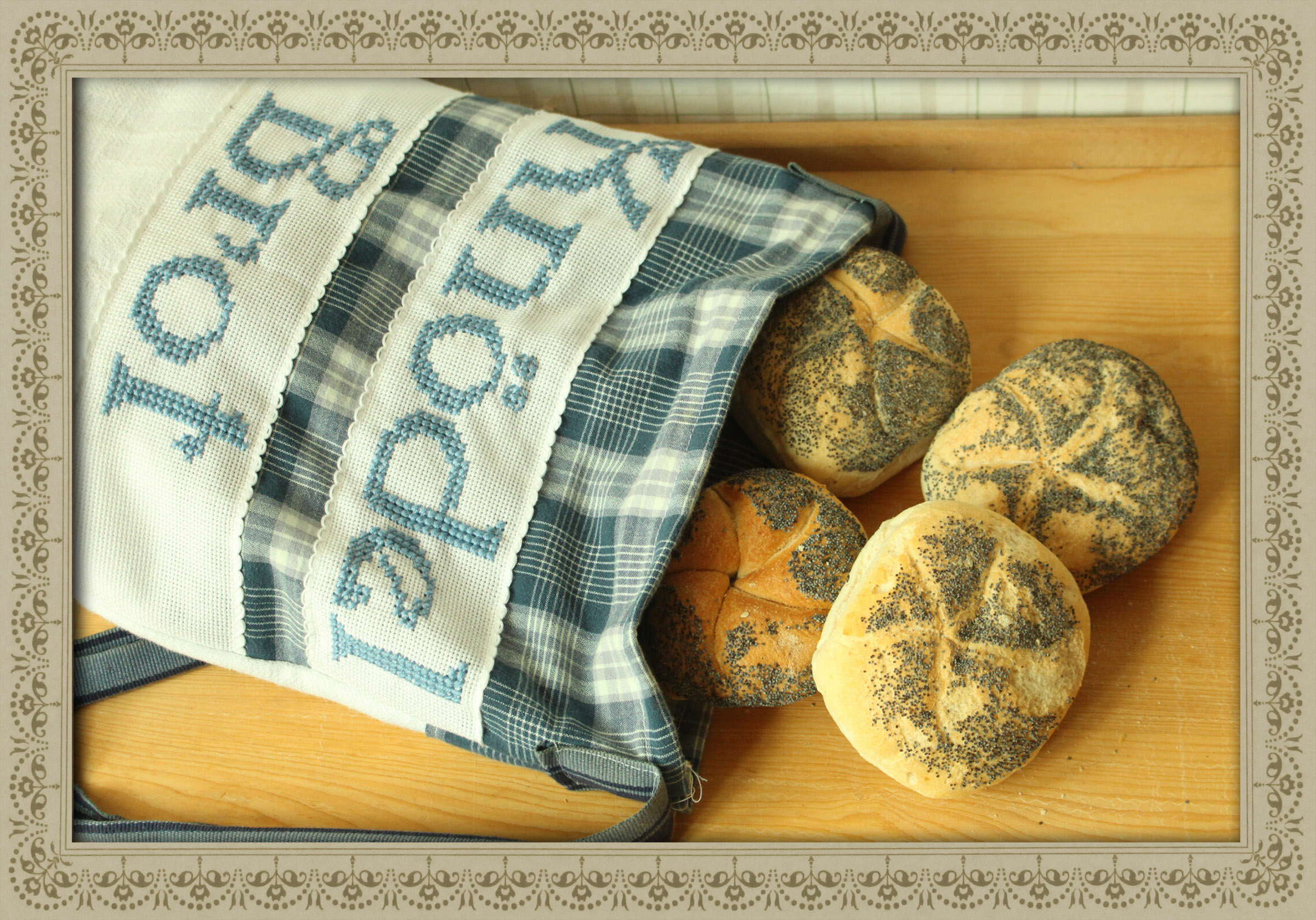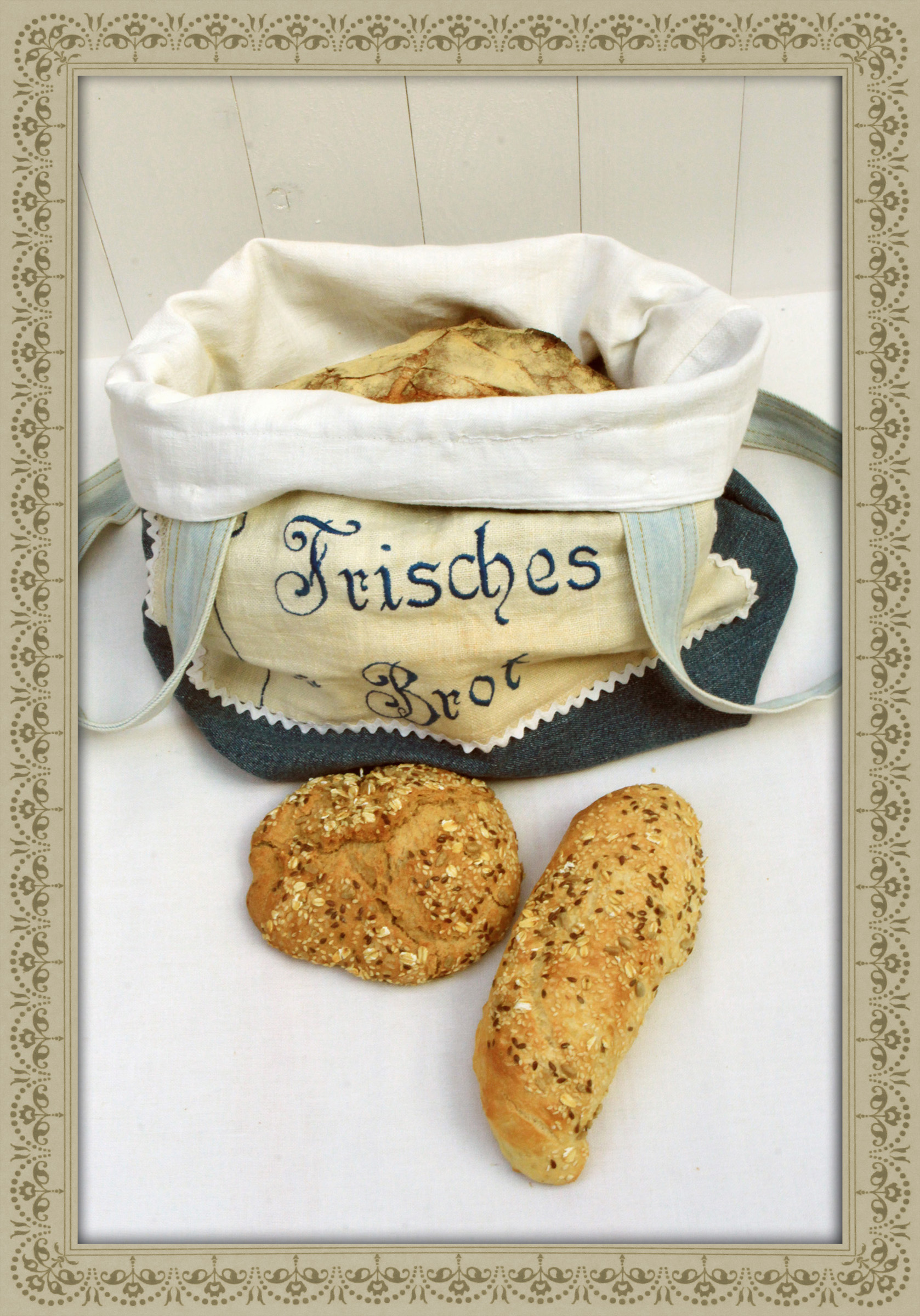Die ordentliche Aufbewahrung von Brot hatte einen hohen Stellenwert. Brotbeutel aus Leinen waren mit Stickereien wie „Frisches Brot“, „Brötchen“ oder „Unser tägliches Brot“ versehen. Durch die häufige Verwendung haben die Beutel oftmals deutliche Gebrauchsspuren. Für die Weiterverwendung zur Aufwertung einer Einkaufstasche sind die Stickereien immer noch sehr dekorativ. Vor allem zum Trocknen von Knödelbrot sind die Beutel praktisch und schön.
