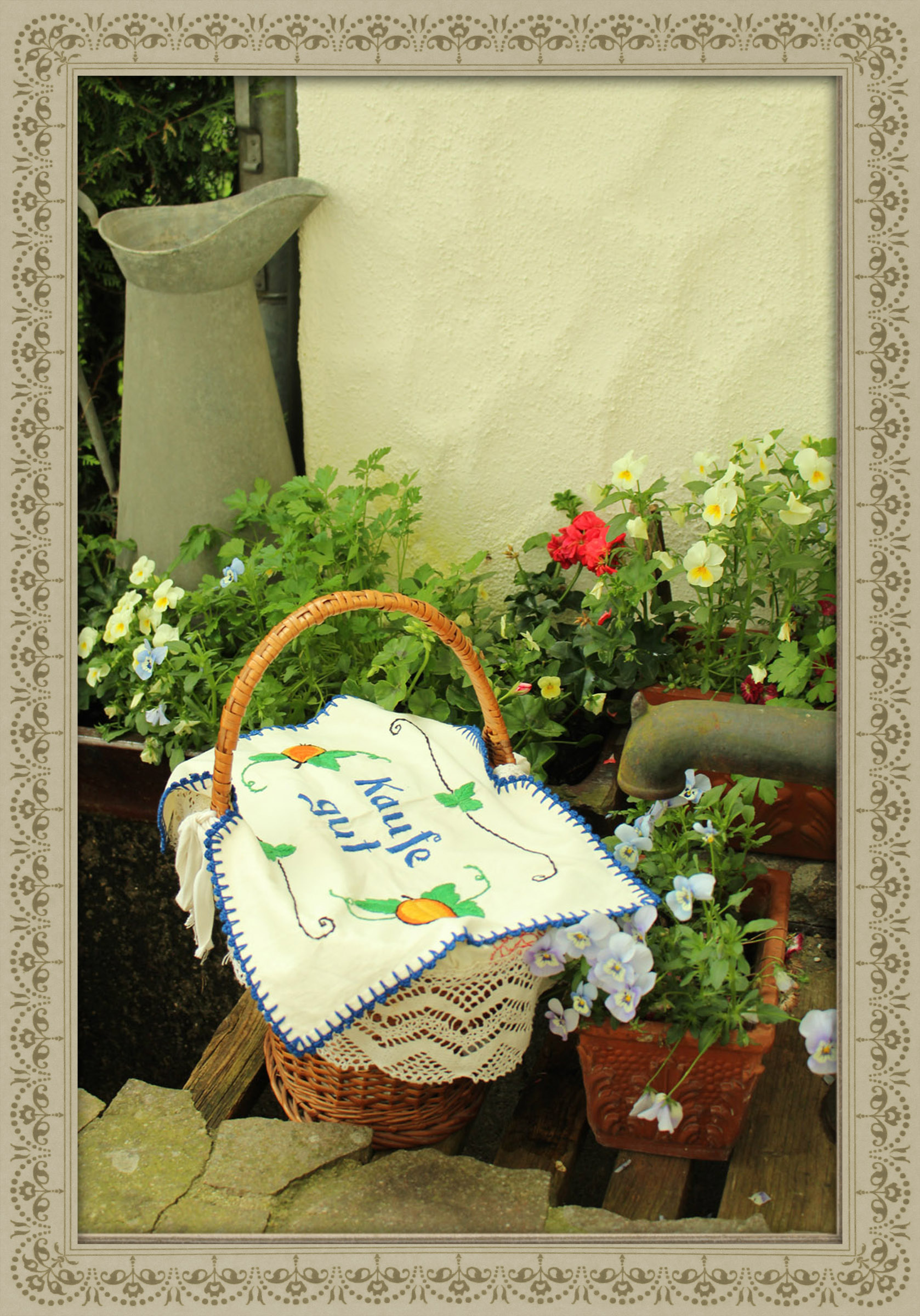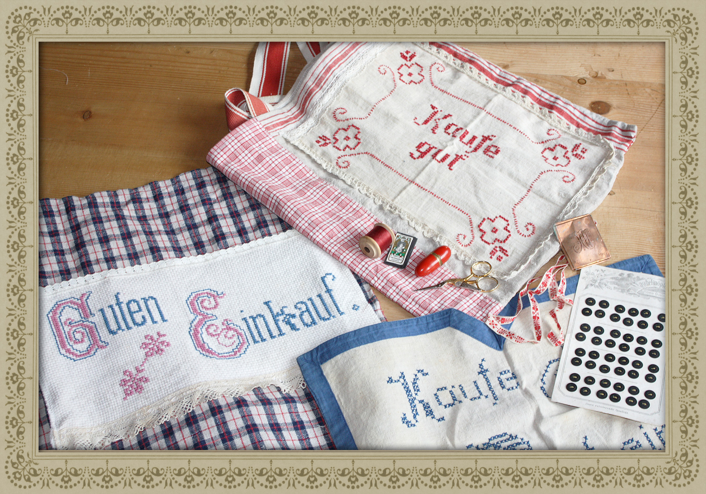 Besonders gerne mag ich Abdecktücher für Einkaufskörbe, die ich als solche verwende. Meistens sind sie mit Wünschen wie „Guten Einkauf“ versehen, manchmal sind jedoch auch mahnende Worte aufgestickt, die zum sparsamen Kauf auffordern.