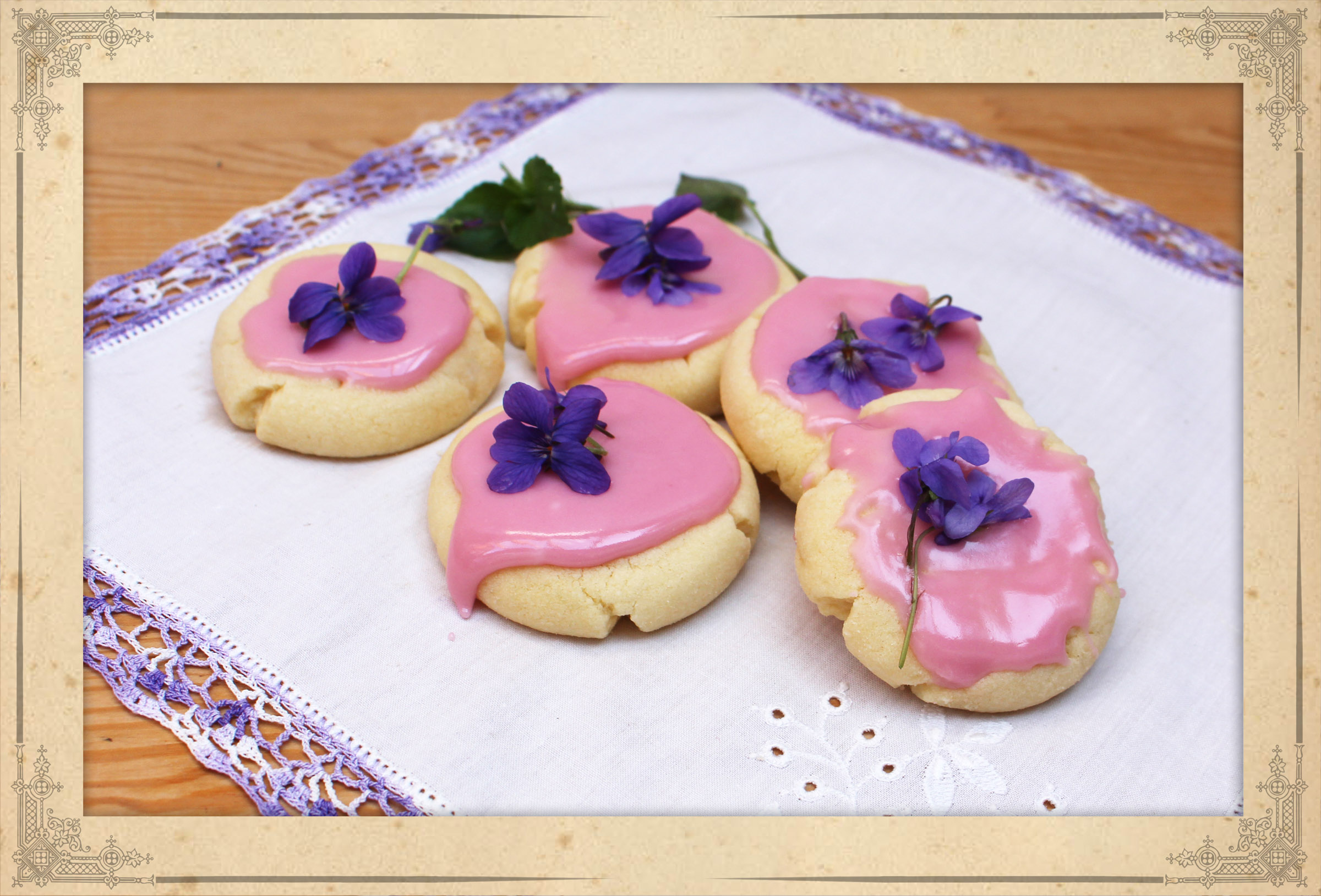 Den Zuckerguss auf die Kekse verteilen und mit Veilchenblüten verzieren.