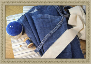 Für dieses Nähprojekt wurden eine alte Jeans und ein Stück Leinen aus einem ausgedienten Musterbuch gewählt. Beide Stoffe sind so dick und stabil, dass die Topflappen nicht gefüttert werden müssen.