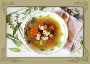 Nun die Zwiebeln würfeln, den Lauch in Ringe schneiden und die Karotten schälen und in kleine Stifte schneiden. Danach wird der Knoblauch mit dem Salz vermischt. Öl in die gleiche Pfanne geben und zuerst die Zwiebeln kurz anschwitzen, danach den Lauch und die Karotten in die Pfanne geben und anbraten. Die gehackten Kräuter zusammen mit der Knoblauch-Salz-Mischung, Kümmel und Pfeffer in die Pfanne geben, mit der Brühe aufgießen und ca. 10 Minuten köcheln lassen. Das geröstete Brot zur Suppe dazugeben.